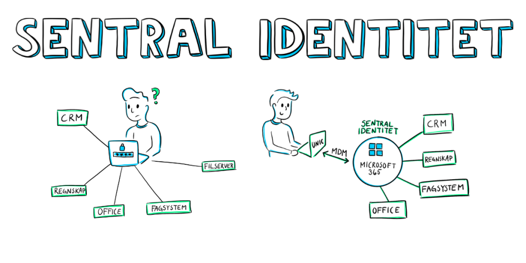 Vi anbefaler at du samler alle tjenestene dine. Ta i bruk en sentral identitetsplattform som gir en mer behagelig brukeropplevelse og som gir et sikrere IT-system. Uten en slik felles identitetsplattform mister du oversikten over hvem som har tilgang, og hva de har tilgang til. Ofte blir også tilgangene hengende igjen etter at den ansatte har sluttet.